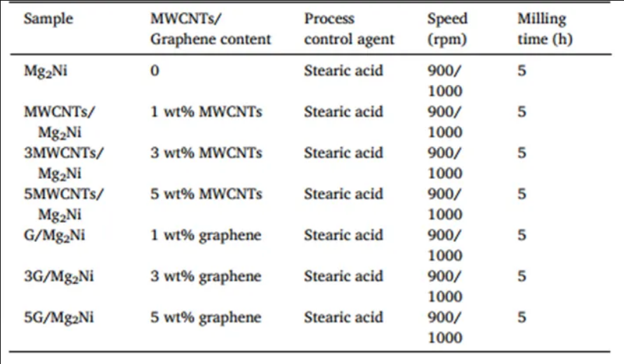 高能球磨制備Mg2Ni復合石墨烯和MWCNTs材料