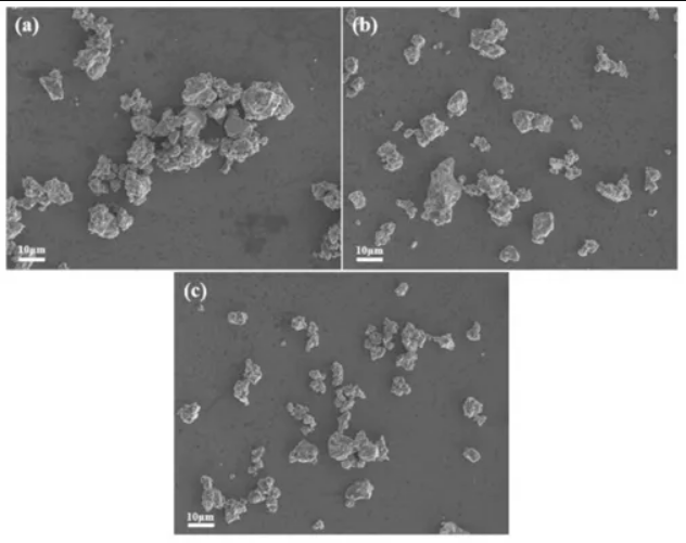 Mg2Ni合金顆粒呈現(xiàn)凹凸不平的形狀和粗糙的表面織構。圖2(a)表明顆粒團聚和融合明顯,粒徑分布不均勻,超過10μm的顆粒普遍存在。這主要是由于球磨過程中韌性組分、鎂元素、分層和粘結造成的。球磨機的頻繁沖擊導致材料不斷破碎,少量的MWCNTs不能提供足夠的潤滑,導致顆粒尺寸變大。隨著MWCNTs用量的增加,其提供潤滑的作用更加明顯。粉末顆粒尺寸減小,團聚和焊合現(xiàn)象的發(fā)生減少。這表明摻入MWCNTs可以有效地減少團聚和融合的發(fā)生。