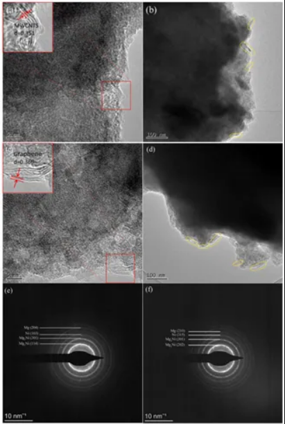 圖4 不同放大倍數下MWCNTs與石墨烯復合材料的TEM圖像:(a)-(b)3MWCNTs/Mg2Ni,(c)-(d)3G/Mg2Ni,(e)-(f)3MWCNTs/Mg2Ni的SAED