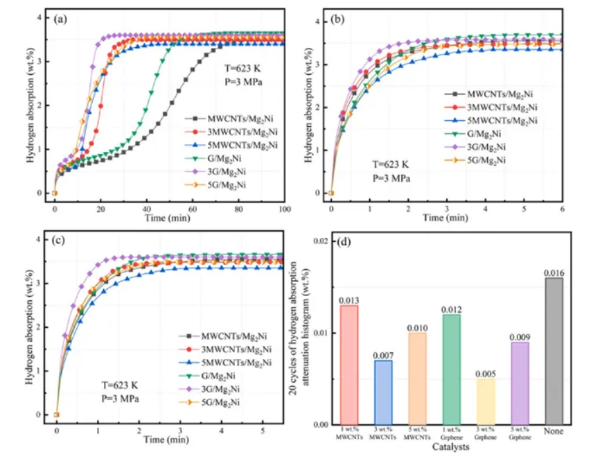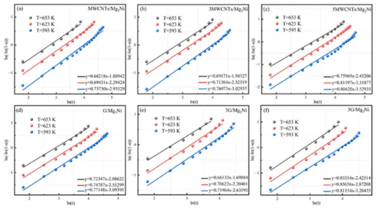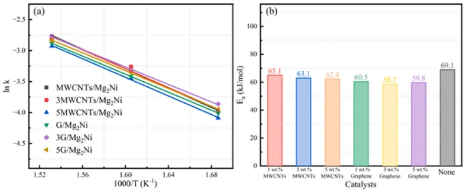 MWCNTs和石墨烯的結合有效地降低了Mg2Ni合金放氫反應所需的活化能,從而提高了放氫動力學效率。特別值得注意的是,在3wt%石墨烯復合材料中,激活能最低為58.7kJ/mol,與Mg2Ni合金相比降低了約10kJ/mol。這突出了合金放氫動力學最有效的增強。
