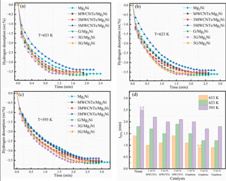 圖6 不同添加量的MWCNTs和石墨烯復合材料在不同溫度下的放氫動力學曲線:(a)653K;(b)623K;(c)593K;以及(d)達到最大放氫量95%所需時間的柱狀圖