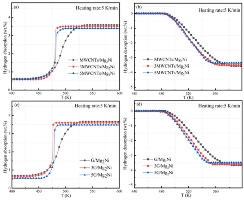 當添加量為3wt%時表現(xiàn)出最佳的吸氫性能,在475K的溫度下,在200s內迅速達到吸氫的飽和狀態(tài),在達到吸收溫度后表現(xiàn)出穩(wěn)健的吸氫動力學。隨著5wt%MWCNTs的引入,放氫飽和溫度為545K,放氫速率也略有上升。與MWCNTs樣品相比,3G/Mg2Ni476K左右表現(xiàn)出更冷的吸氫量,具有更強的動力學特性,可以在150s內快速達到吸氫飽和。